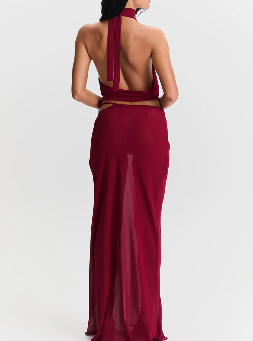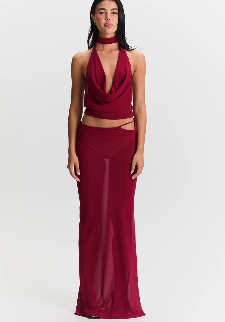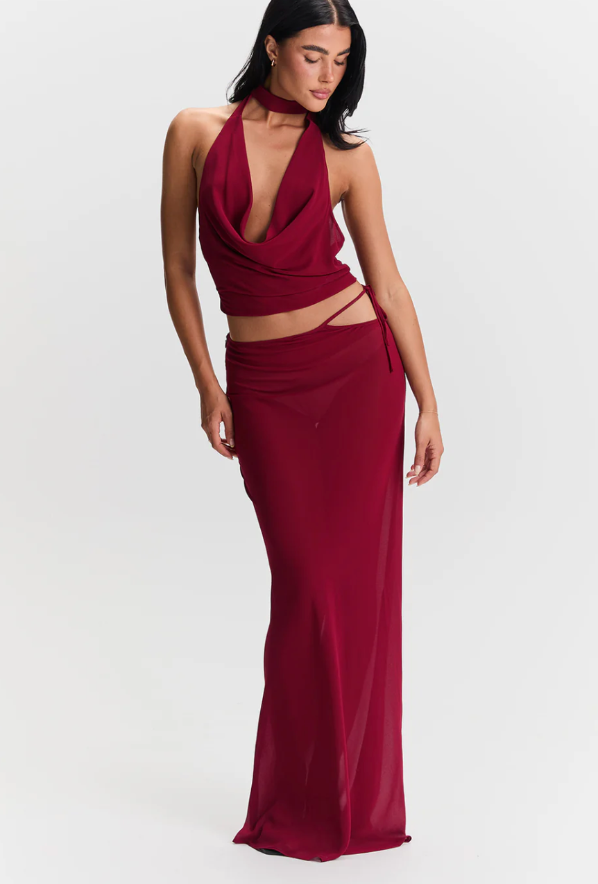 Make a statement in our Cherry Red Aubrey Set. Featuring a flattering side hip cut-out with adjustable ties and a gorgeous maxi length, our Aubrey skirt is the perfect resort wear styling piece for summer. Pair her back with our Red Aubrey Top for a head to toe statement.