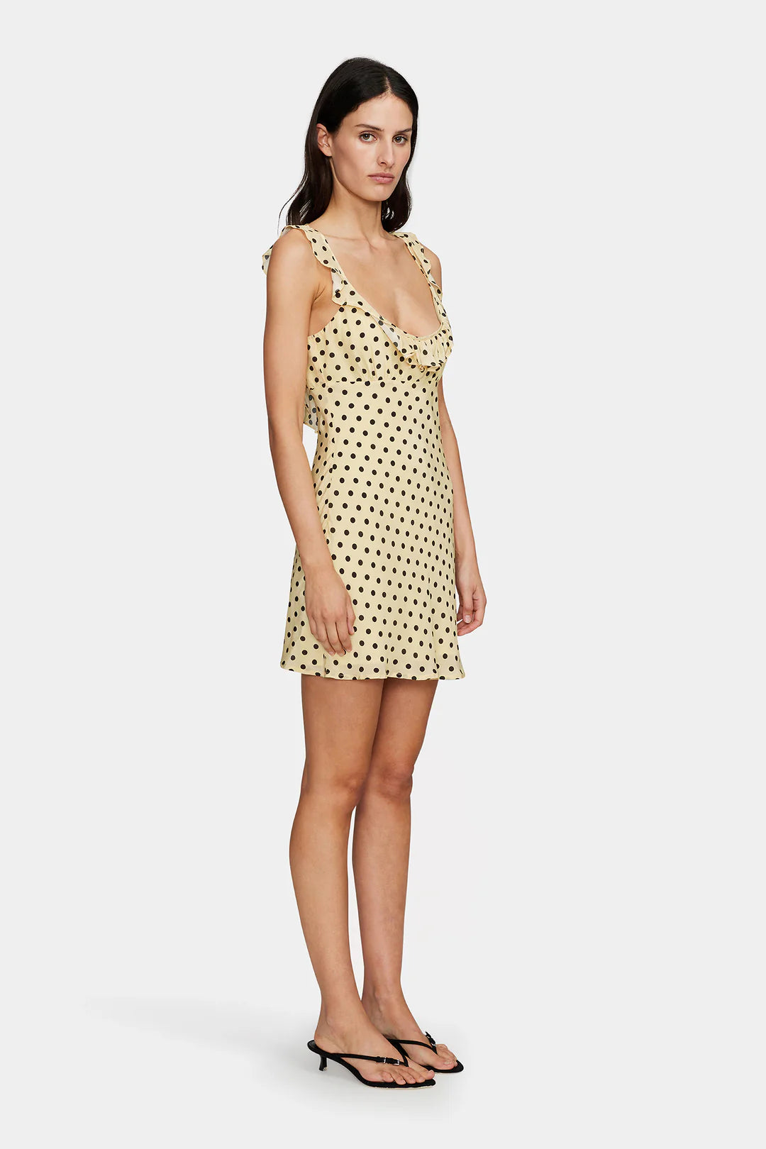 The Candy Mini Dress is a bias cut mini dress with a scooped frill neckline and an open back. The dress is fully lined for ease of wear and there is a tie at the back for support. Dress up or down this mini can take you anywhere.