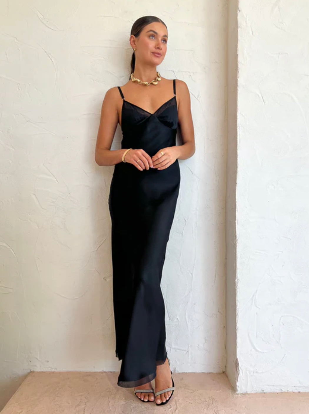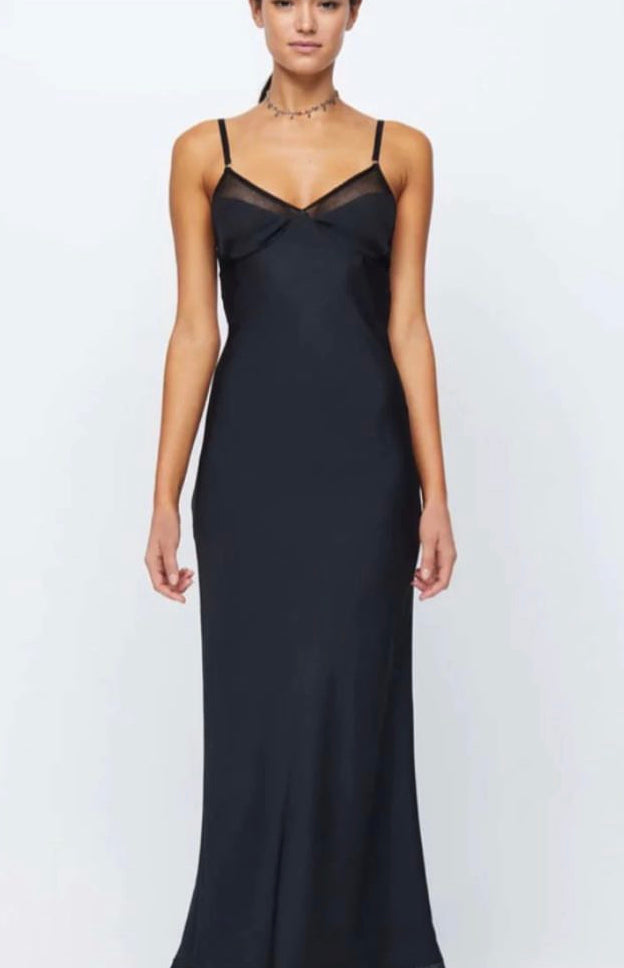 A chic and classic silhouette, the Joelle Maxi Dress is cut on the bias from a soft and slinky fabric with statement cotton mesh contrast. The dress features elastic adjustable straps with metal o-rings and a back bra panel that is secured with an e-hook closure at an open, scooped back.