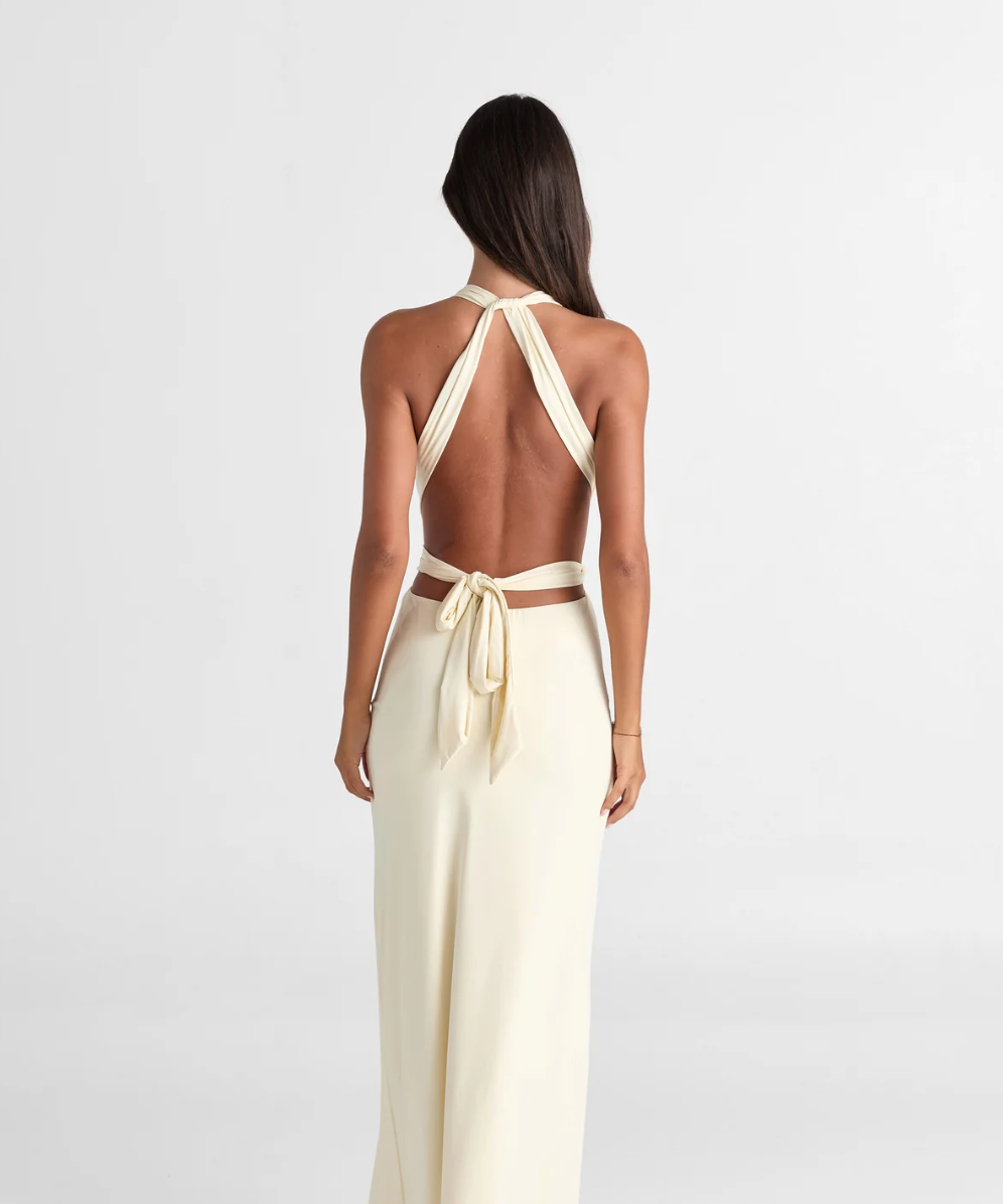 Introducing our Mira Maxi Dress. Featuring a plunging neckline with gathered bust panels, our Mira Maxi Dress is fully adjustable and can be styled multiple ways. Made from our signature buttery soft fabric with an open back, it is fully lined to give you the most flattering silhouette. The gold hardware details have been designed to move along the tie straps in order to adjust bust coverage and to compliment you in all the right places.